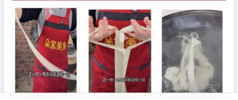 伸ばして引き裂くことを繰り返し、生地は長く薄くなるので、沸騰した湯に入れて麺を茹で上げます。
